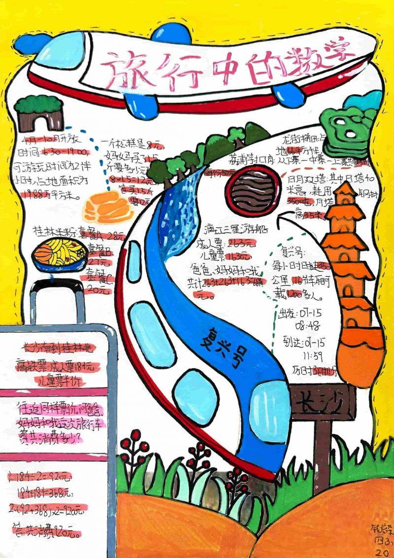 翻开一张张精心绘制的手抄报,仿佛开启了一本本行走的数学宝典:有的同学化身家庭旅行规划师,通过计算高铁时速与里程的关系推算出最佳出行时段;有的把景区门票、餐饮住宿的支出制作成统计图表,用加减乘除验证"花最少的钱玩最多景点"的旅行攻略;更用几何图形巧妙勾勒出山川湖泊的轮廓。这些色彩斑斓的作品里藏着千米与米的换算秘密,藏着24时计时法与日出日落的美妙关联,藏着用分数分配旅行箱空间的生活智慧。每一道计算题都是丈量世界的脚步,每一个统计表都在诉说旅途中的数学故事,让我们为这些善于观察、勤于思考的小旅行家点赞!