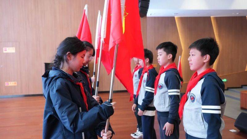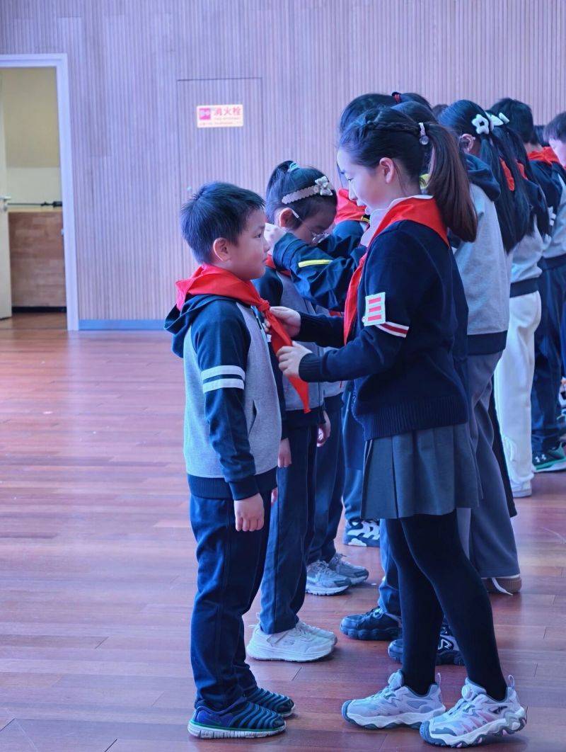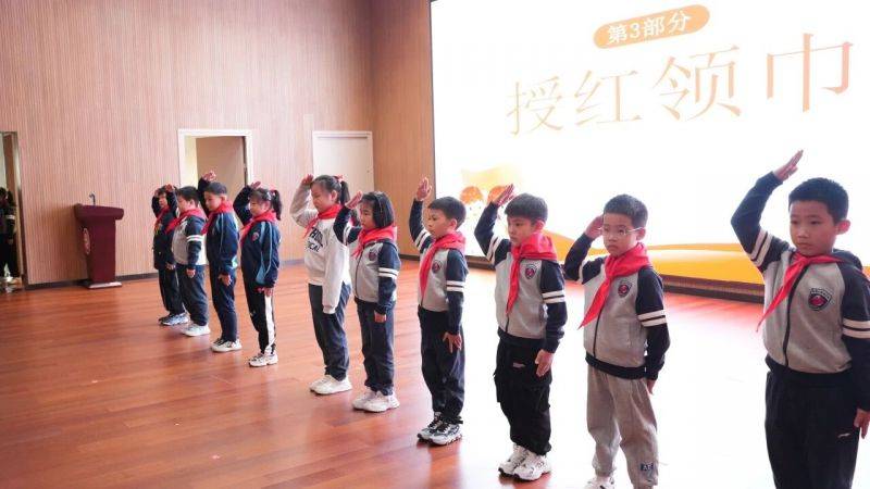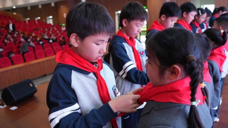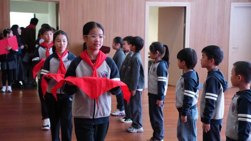 在热烈的掌声中,少先队辅导员宣读了二年级入队学生名单。少先队员代表手捧红领巾,郑重地为新队员系上这抹光荣的红色。