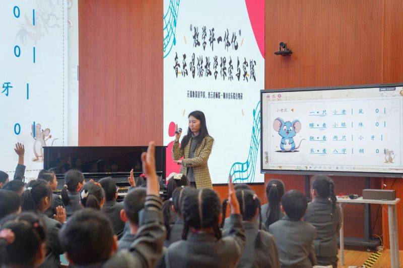 这是一堂充满欢声笑语的音乐戏剧课。孩子们通过拍手、踮脚感知节奏快慢,在角色扮演中学习附点节奏。锣声响起,“小老鼠”轻跳躲藏,“小花猫”威武追击,音乐知识与表现力在游戏中自然生长。