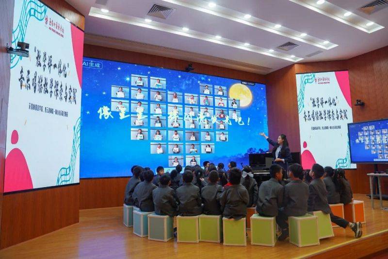孩子们在“旋律木头人”游戏中掌握休止符,用双响筒感知四二拍强弱规律,更通过动作创编、歌词填充和AI画作展示,实现音乐与美术、科技的跨学科融合。在坚定的歌声中,航天梦想与民族自豪感悄然生根。