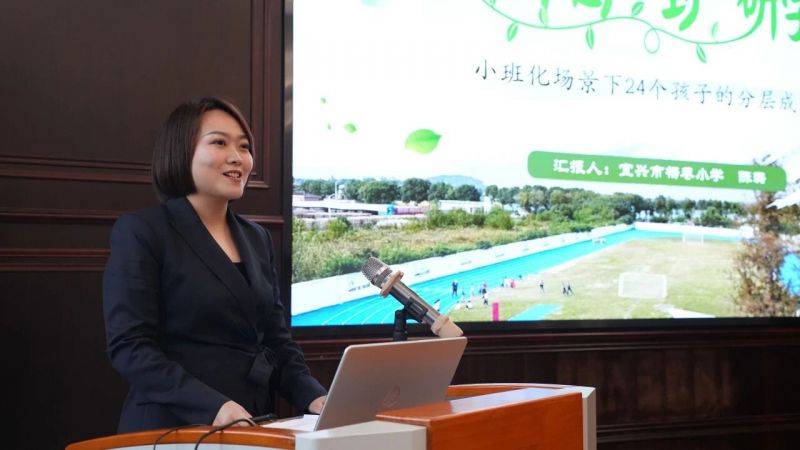 在下午的会议上,常青外国语学校校长姚建光作了《小班化,从“看见每一个”到“成就每一个”——常青外国语学校小班化教学五年实践全景录》主题汇报。东域小学、培源实验小学、杨巷小学三所试点学校依次登台,分享小班化教学实践经验: