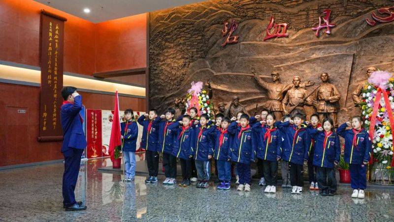 少先队员们参观党史成立馆,通过多种形式,歌颂党的丰功伟绩和新中国取得的伟大成就,引导更多的人一起学习党史,传承红色基因,把红色基因植入孩子们的心田。