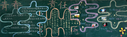 经过同学们的集思广益,精心构思, 12月9日我校初一和初二年级以班级为单位的、以“青春与责任”为主题的黑板报评比闪亮登场了。黑板报版面图文并茂,主题鲜明,立意深远,洋溢着青春与激情,质朴而感人。反映出了同学们勇于承担责任的精神和报效国家的宏伟志向。