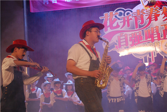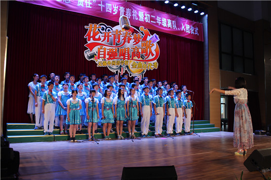 下午,青春•感恩•责任——十四岁青春礼暨初二年级离队、入团仪式结束后,初二专场开幕。一曲《冬天里的一把火》点燃了同学们的热情,开启了初二金曲年代秀之旅。之后,《放心去飞》《红日》《大海》相继登场,掌声阵阵。紧接着,初二(9)班独具特色的《笨小孩》将歌会推向第一个高潮。随后,又有初二(15)班的《海阔天空》和初二(7)班《牛仔很忙》以新奇的创意,逼真的表演,劲爆的歌舞,征服了广大师生。最后,初二(3)班的《倍儿爽》热烈欢快,歌舞加说唱,引爆全场,将歌会推向最后的高潮。