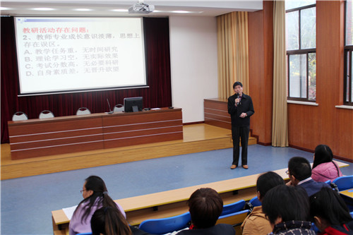 讲座主要围绕学校教研组建设的多个方面展开,着重对“如何提高教研活动的有效性”提出了独到的见解。吴老师指出:提升教研组长的工作能力,是活动有效的关键;精心筛选满足教师实际需求的教研内容,是活动有效的根本;基于“对话”的教研方式,是活动有效的前提;全员参与教研活动全过程,是活动有效的保证;逐步完善评价体系,是活动有效的助推器。吴老师还就“如何建设优秀教研组”提出了五点建议,特别强调了教研活动任务化责任化的重要性。最后,吴老师送给全体与会教师一句话:“坚持活动,就有活力;创新方法,必然得法”。