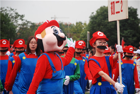 现在向我们走来的是初二2班的同学,他们有着和马里奥一样坚持不懈的精神!洪荒之力,勇夺桂冠是他们的口号,初二二班的每一位同学都将爆发他们体内的洪荒之力,创造出灿烂辉煌!奔跑吧,马里奥!