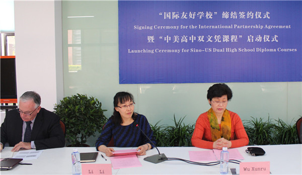无锡外国语学校李莉校长对和美国高中的合作充满了信心和期待,她在致辞中说:我校将在总结完善三年初中国际课程的基础上,借助剑桥国际教育中心的优势资源,密切和美国玛瑞丹中学的交流合作,既保持国内基础教育的数理优势,又为学生提供适合个性发展的多重文化教育,集中精兵强将加快中外教育比较研究和国际高中课程的创新发展。作为无锡地区唯一一所外语特色学校,经过17年的发展,学校已形成外语与国际教育特色、创新与创意教育特色,为国内外一流高中学校输送了大批高素质、宽视野、强能力的国际化创新型后备人才。藉此剑桥国际教育中心成立启用和中美双文凭课程启动,学校将再创事业的新辉煌。