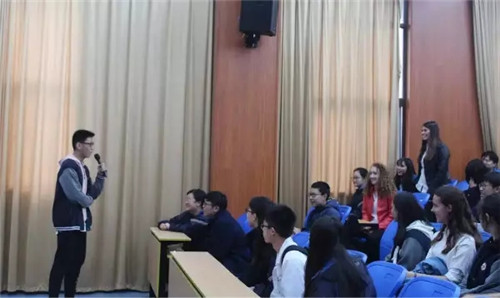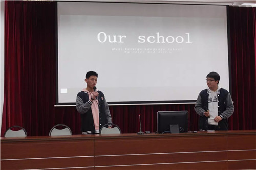 随后,由10年级A班夏彰特同学和10年级C班柯伯承同学为美国朋友们介绍了他们的校园生活,两位同学的演讲风格轻松自然,并不时与美国伙伴们提问互动,现场爆发出一阵阵笑声,气氛活跃。